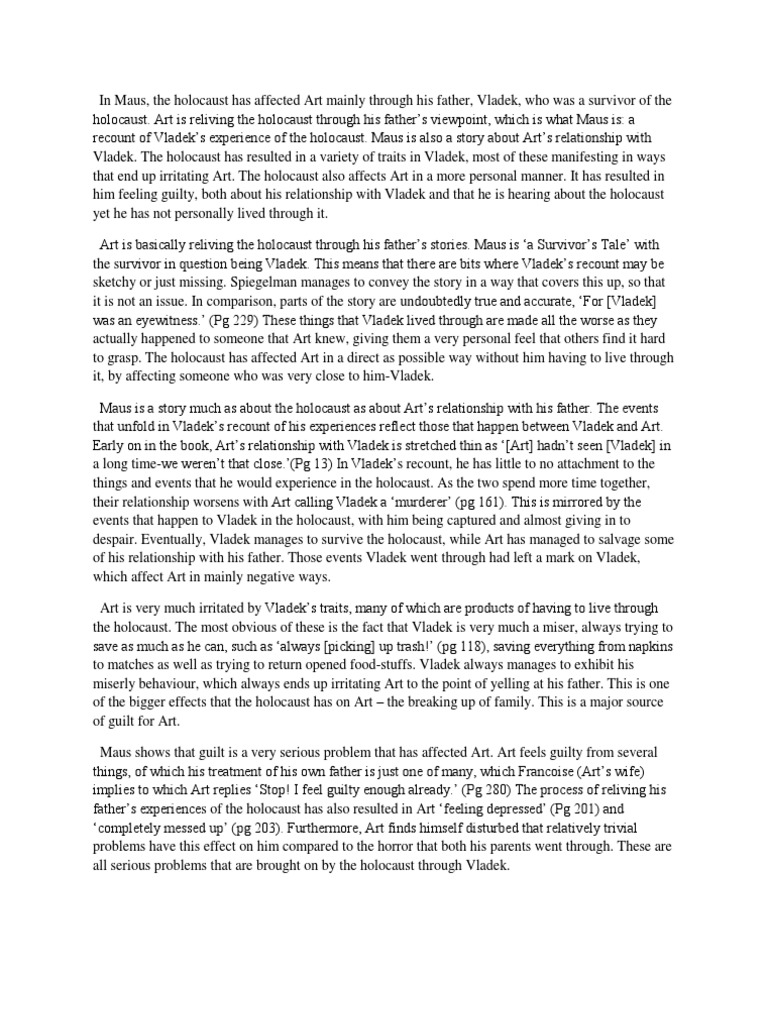 These works act as a way to explore such stereotypes about Jews and the aftermath of maus essay topics Holocaust especially exploring how it affects the next generation. Such a situation creates many dilemmas for the offspring of the survivors such as guilt, remorse, jealousy and envy. In the case of young Artie, he seems obsessed by the past as if it will shed some light on his father's thoughts and actions. He is plagued by the shadow of an older brother he never knew yet envies because his parents cannot let him go.